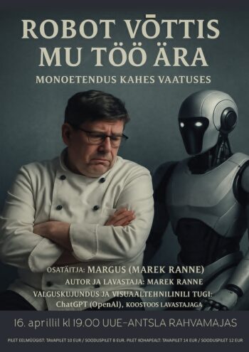 Margus on tavaline keskklassi mees, kelle elu pööratakse pea peale, kui tema töökoha kööki saabub uus töötaja – tehisintellektil põhinev robotkokk. See on lugu tööst ilma jäämisest, väärikuse otsimisest ja inimeseks jäämisest ajastul, kus masinad mitte ainult ei tee tööd, vaid võtavad ka ruumi meie hinges. Laval kulgeb Marguse monoloog läbi humoorikate ja valusate hetkede – argipäevastest olukordadest kuni sügava eksistentsiaalse kriisini. Ta räägib personalijuhiga, vaidle juhatajaga, meenutab tööraamatut ja püüab mõista, millal inimene muutus kuluks. Lugu on vaimukas, emotsionaalne ja kriipivalt ajakohane – peegeldus ühiskonnast, kus tehnoloogia edusammud pole enam ulme, vaid igapäevane reaalsus. Ja keset seda seisab Margus – üks mees, kellelt võeti töö, kuid mitte hääl.